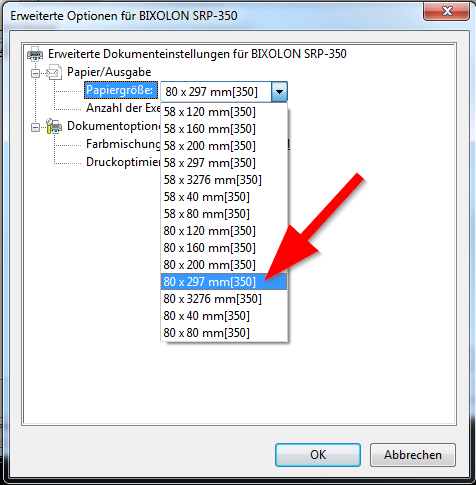 5. Papiergröße auf „80 x 297“ stellen und mit OK bestätigen.