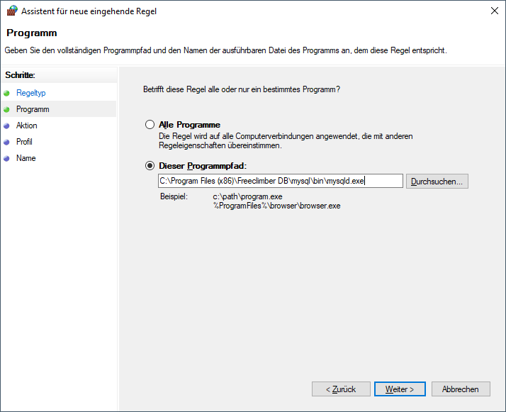 MySQL Server auswählen „C:\Program Files (x86)\Freeclimber DB\mysql\bin\mysqld.exe“
