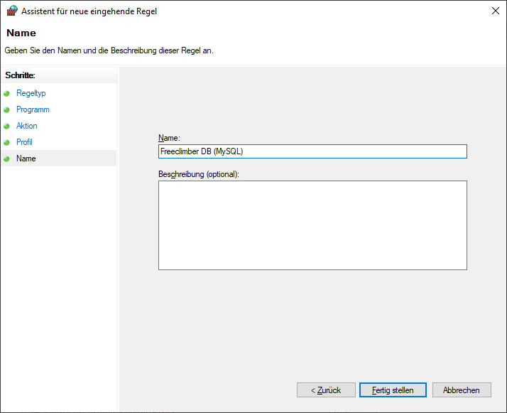 „Freeclimber DB (MySQL)“ als Name eintragen