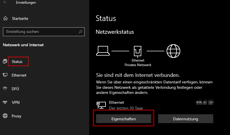Einstellungen -> Netzwerk und Internet -> Status -> Eigenschaften -> Netzwerkprofil -> Privat