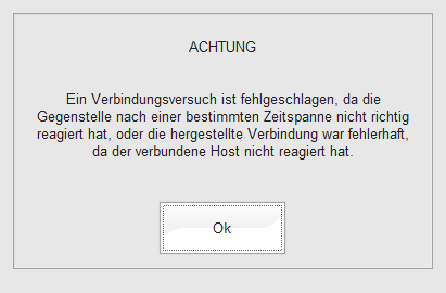 Wenn folgenden Meldung kommt, kann sich die Kasse nicht mehr mit der Hauptkasse (Server Datenbank) verbinden.